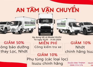 Đại lý Isuzu Đại Thịnh triển khai chương trình khuyến mại Dịch vụ hậu mãi “An tâm vận chuyển”: Giảm giá công bảo dưỡng & phụ tùng bảo dưỡng.